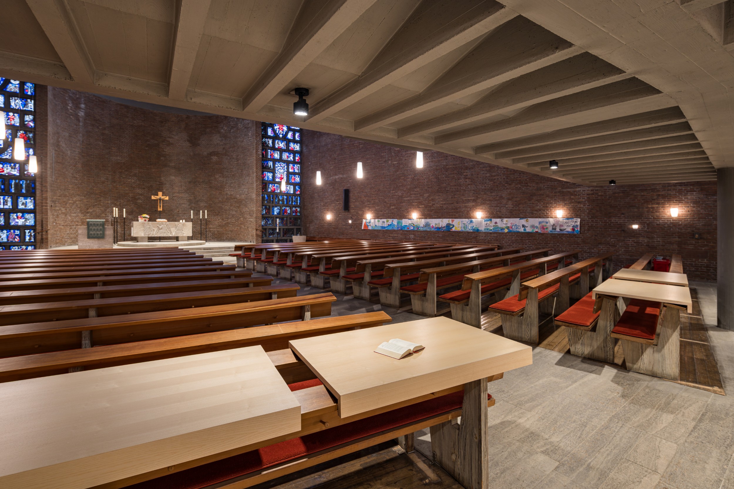 Die Beleuchtung des Altarbereichs wurde vollständig erneuert und ergänzt. Zuvor war dieser Bereich nur unzureichend ausgeleuchtet – der Küster behalf sich mit Baustrahlern, damit der Chor die Noten lesen konnte. Heute sorgt ein fein abgestimmtes Lichtkonzept für eine stimmungsvolle und funktionale Ausleuchtung ohne sichtbare Verkabelung, um die denkmalgeschützte Architektur nicht zu beeinträchtigen.